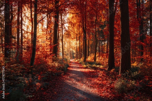 © Ifti Digital, Obraz premium Sunlit autumn forest path covered with vibrant red leaves and golden light illuminating the trees during a peaceful afternoon stroll in nature's tranquility