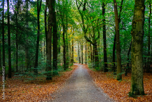 © Kirill, Obraz premium Sunlit autumn forest path lined with tall trees and colorful fallen leaves