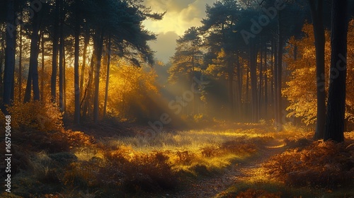 Fototapeta premium Sunlit Autumn Forest with Golden Rays and Pathway