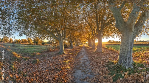 © BerkahStock, Fototapeta premium Sunlit autumn path lined with trees, leaves on ground.