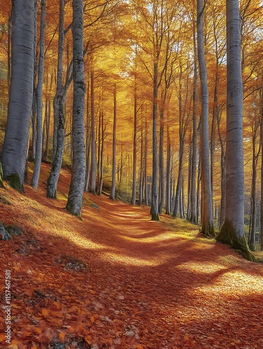 © Banci, Obraz premium Sunlit autumn path through vibrant forest. (4)