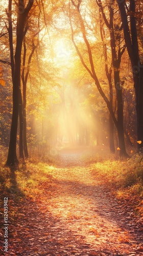 Fototapeta premium Sunlit autumn pathway in serene forest with golden leaves and morning light