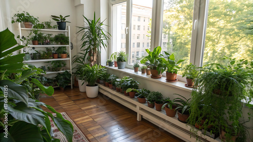 Fototapeta premium Sunlit balcony filled with lush green houseplants on shelves and windowsill