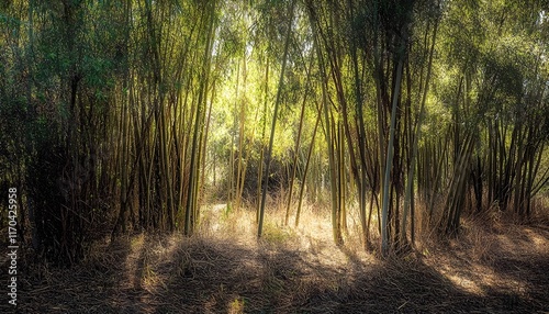 Naklejka premium Sunlit Bamboo Forest, Peaceful Nature Scene