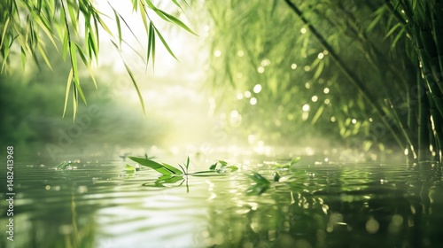 © Raizen creative, Fototapeta premium Sunlit Bamboo Forest Reflection Over Calm Water Surface with Green Leaves in Nature
