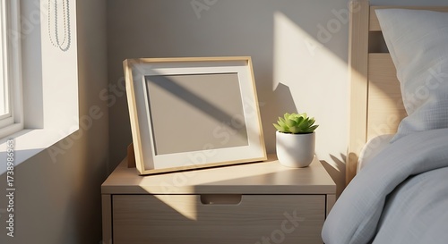 Obraz premium Sunlit Bedroom Still Life - Empty Frame, Succulent, and Morning Glow.