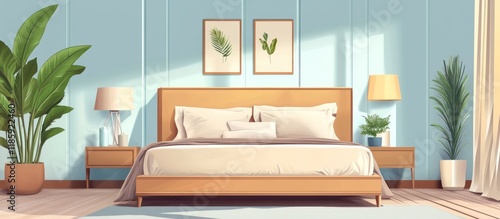 © Mega, Obraz premium Sunlit bedroom with wooden bed, plants, and minimalist decor.