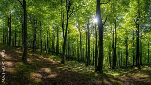 Naklejka premium Sunlit Beech Forest Path, Spring Sunlight, Green Canopy, Nature Wallpaper