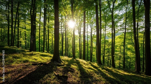 Obraz premium Sunlit Beech Forest Slope, Green Canopy, Sunrise, Nature, Wallpaper