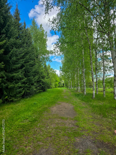 © Nadiia, Obraz premium Sunlit Birches of Botanical Garden Where Nature Meets Science