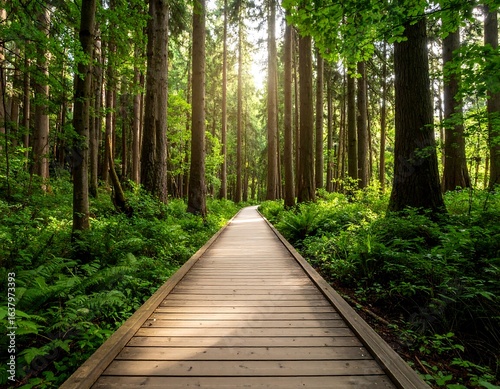 © tola, Obraz premium Sunlit boardwalk path through lush, green forest