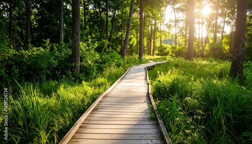 © Abel, Fototapeta premium Sunlit boardwalk through lush forest