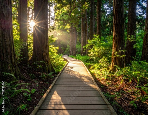 © Hujan, Obraz premium Sunlit boardwalk through lush forest