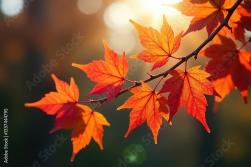 Fototapeta premium Sunlit branch laden with crimson, gold, and russet maple leaves , close-up, forest