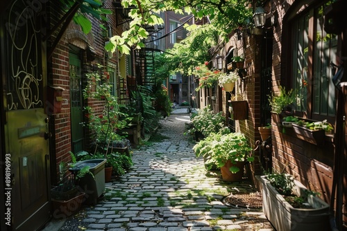 © Nico, Fototapeta premium Sunlit Brick Alleyway with Greenery and Cobblestone Path