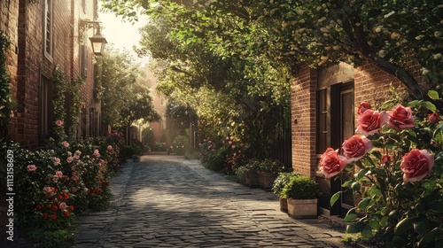 Naklejka premium Sunlit Brick Lane Pathway: A Serene Stroll Through a Floral Paradise