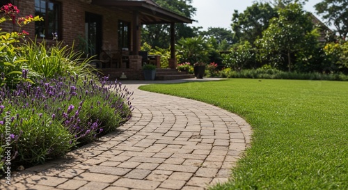 Obraz premium Sunlit Brick Path Winding Through Lavender and Lush Lawn