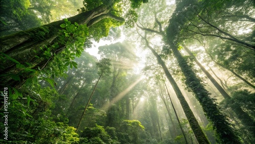 © MDMEHEDI, Fototapeta premium Sunlit Canopy Natures Lush Embrace Beneath Towering Forest Giants