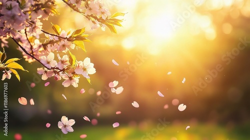 Fototapeta premium Sunlit Cherry Blossom Trees in Full Bloom with Soft Petals Falling