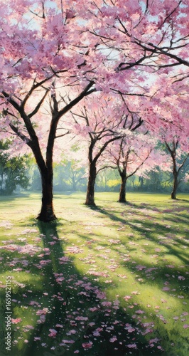 Naklejka premium Sunlit cherry blossom trees, pink petals strewn across a verdant lawn