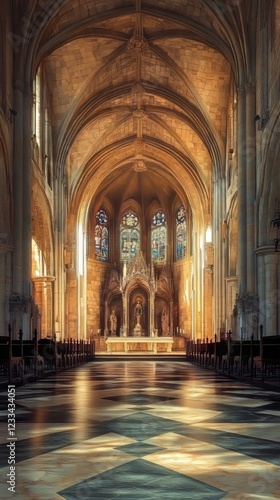 Fototapeta premium Sunlit church interior, serene and grand.