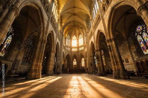 © willem, Fototapeta premium Sunlit Church Interior with Stone Arches and Stained Glass Windows