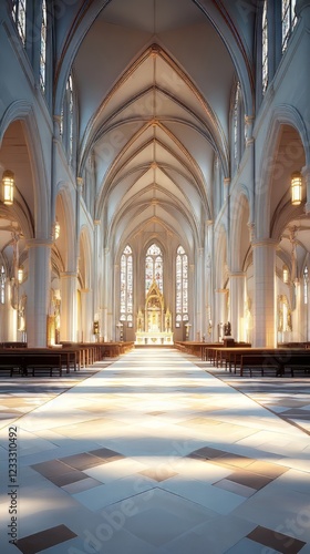 © KOOLAIDMAN100X, Fototapeta premium Sunlit church nave, serene and grand.