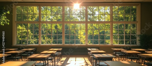 © adiba, Fototapeta premium Sunlit classroom with desks and large window overlooking lush green trees.
