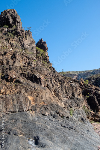 © Aaron, Naklejka premium Sunlit cliff with view and brown rocks