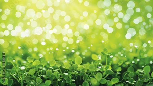 Fototapeta premium Sunlit clover field with morning dew and a bokeh effect. Bright and fresh green foliage creating a serene and vibrant natural scene.