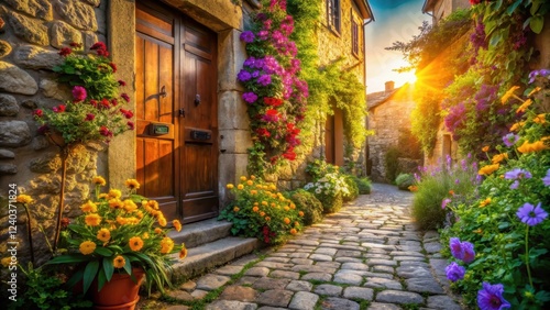 © PloyJai, Fototapeta premium Sunlit Cobblestone Lane Adorned with Vibrant Blossoms and a Rustic Wooden Door