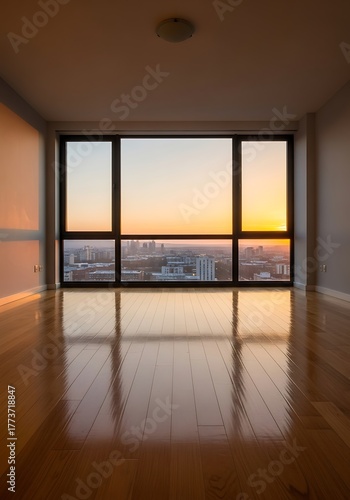 © Sulambu, Obraz premium Sunlit condo interior showcases cityscape view from expansive window
