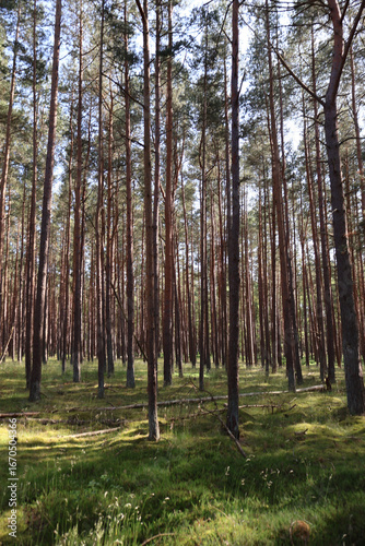 Naklejka premium Sunlit coniferous forest with moss-covered ground, fairytale woodland landscape