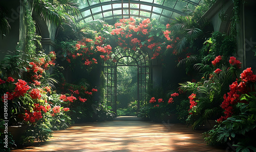 © Get it, Obraz premium Sunlit conservatory path, vibrant red flowers, lush greenery, arched gateway to tranquil garden