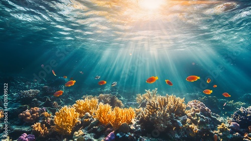 Naklejka premium Sunlit Coral Reef With Vibrant Orange Fish Swimming