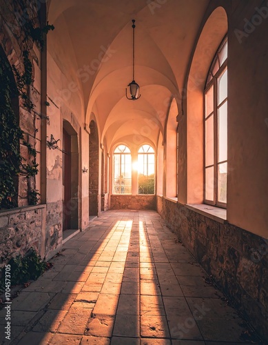 © susi, Fototapeta premium Sunlit corridor with arched ceilings
