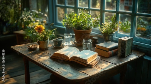 © Omkeni, Obraz premium Sunlit Cottage Window Book Reading Plants