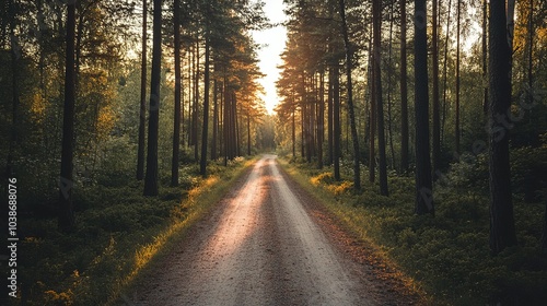 Naklejka premium Sunlit country road lined with trees at dawn, creating a serene atmosphere in...