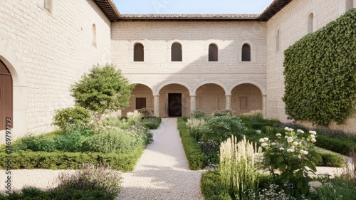 © Yopi, Naklejka premium Sunlit Courtyard Garden With Stone Walls And Lush Greenery