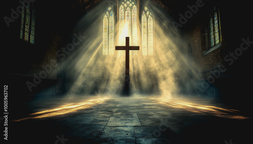© sun, Naklejka premium Sunlit cross in serene gothic cathedral with spiritual atmosphere