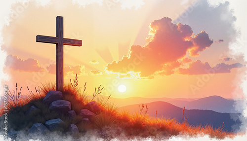 © Anet_foto, Obraz premium Sunlit cross on hill silhouette, spiritual calmness at dawn