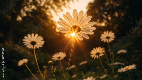 Fototapeta premium Sunlit daisies in serene landscape.