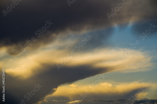 © Gabdulvachit, Obraz premium Sunlit dark stormclouds in blue sky