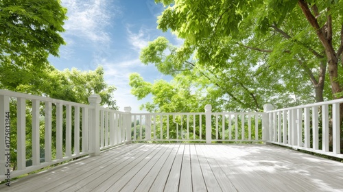 Obraz premium Sunlit Deck View: Tranquil Outdoor Space with Greenery and Blue Sky, Ideal...