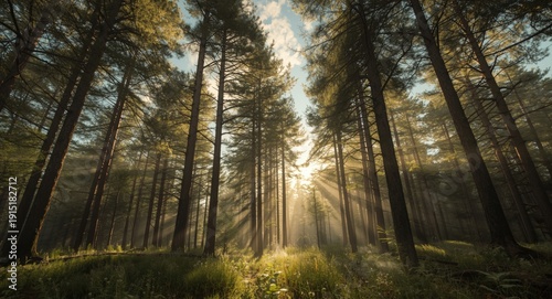 Obraz premium Sunlit dense forest filled with majestic tall pine trees and glowing warm canopy