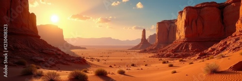 Fototapeta premium Sunlit desert landscape featuring hanging rock formations, arid landscape,...