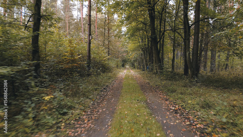 Fototapeta premium Sunlit dirt road through quiet forest