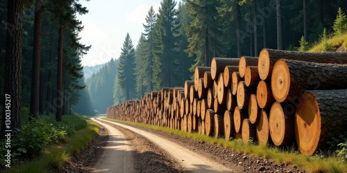 © supansa, Fototapeta premium Sunlit dirt road winding through a dense pine forest lined with neatly stacked lumber logs