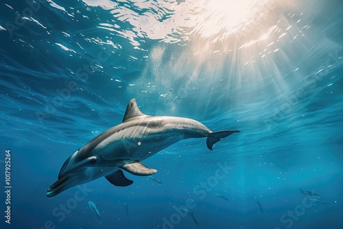 Fototapeta premium Sunlit Dolphins Swimming Underwater in Crystal Clear Ocean