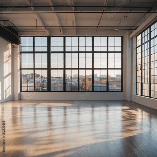 © BerkahStock, Fototapeta premium Sunlit empty loft interior with large windows and hardwood floors.
